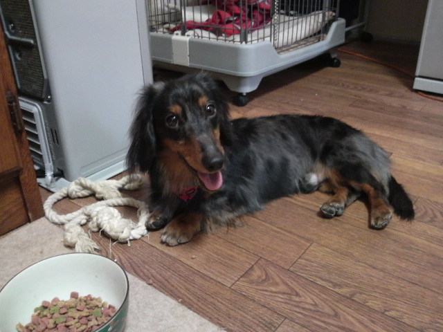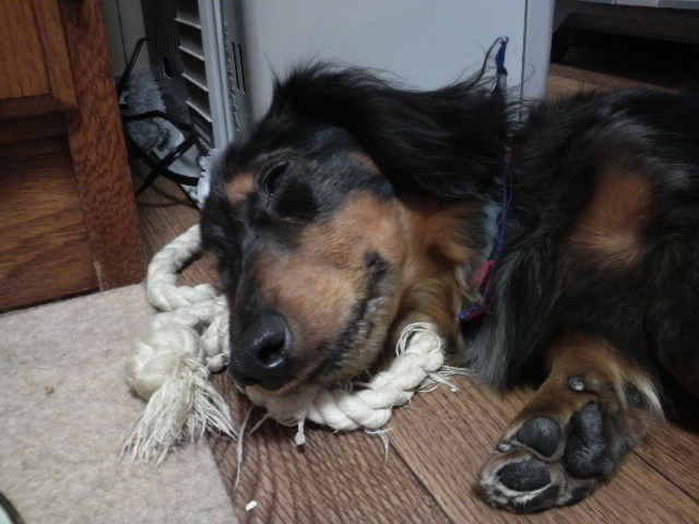 自分のおもちゃのロープを枕にして…